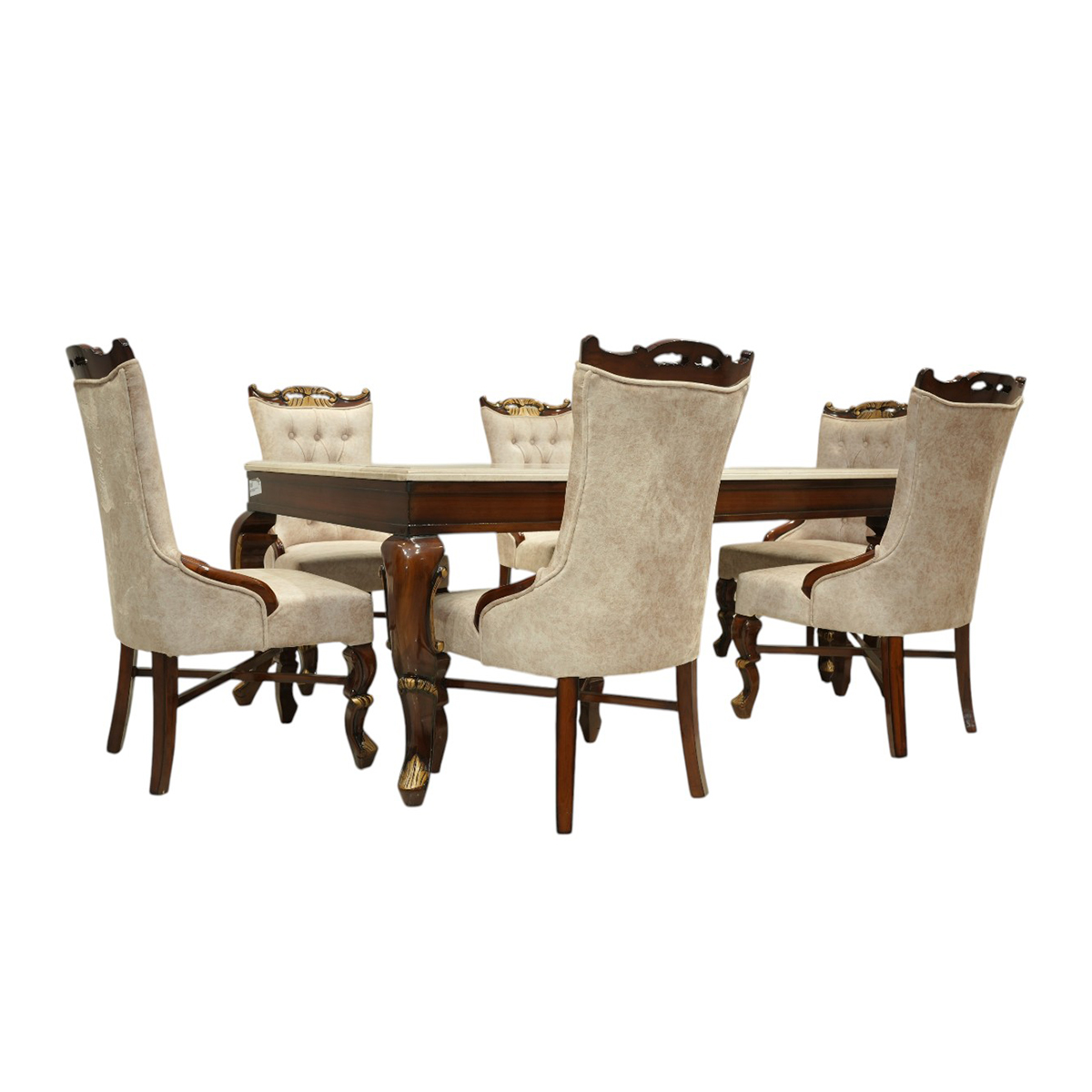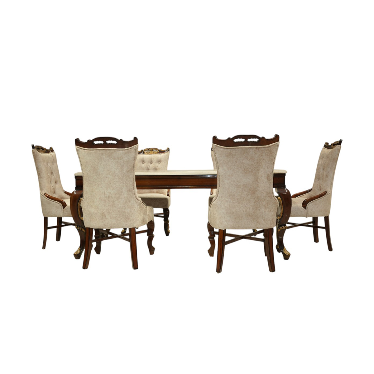 This dining collection represents the pinnacle of furniture craftsmanship, where traditional woodworking expertise meets contemporary design excellence. Each teak wood component is carefully selected, precisely cut, and expertly joined using time-tested techniques. The marble top is professionally fitted and secured to ensure perfect stability and longevity. The ultrasoft suede upholstery is meticulously applied with reinforced construction to provide lasting comfort and durability.