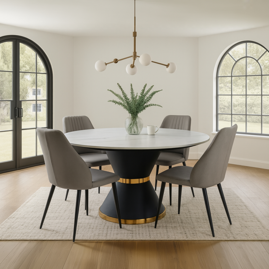 The thoughtful integration of artificial marble, metal, and fabric creates a dining set that exemplifies contemporary design principles while providing all the practical benefits modern families require. This material combination ensures durability, easy maintenance, comfortable seating, and sophisticated styling that works beautifully in today’s home environments.