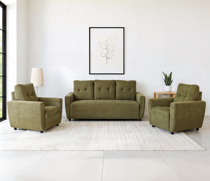 A refined sofa set upholstered in smooth suede-feel fabric, built with kiln-dried, precision-crafted wood for enhanced durability. Finished with strong fibre legs, it offers lasting comfort and a sophisticated look for contemporary homes.