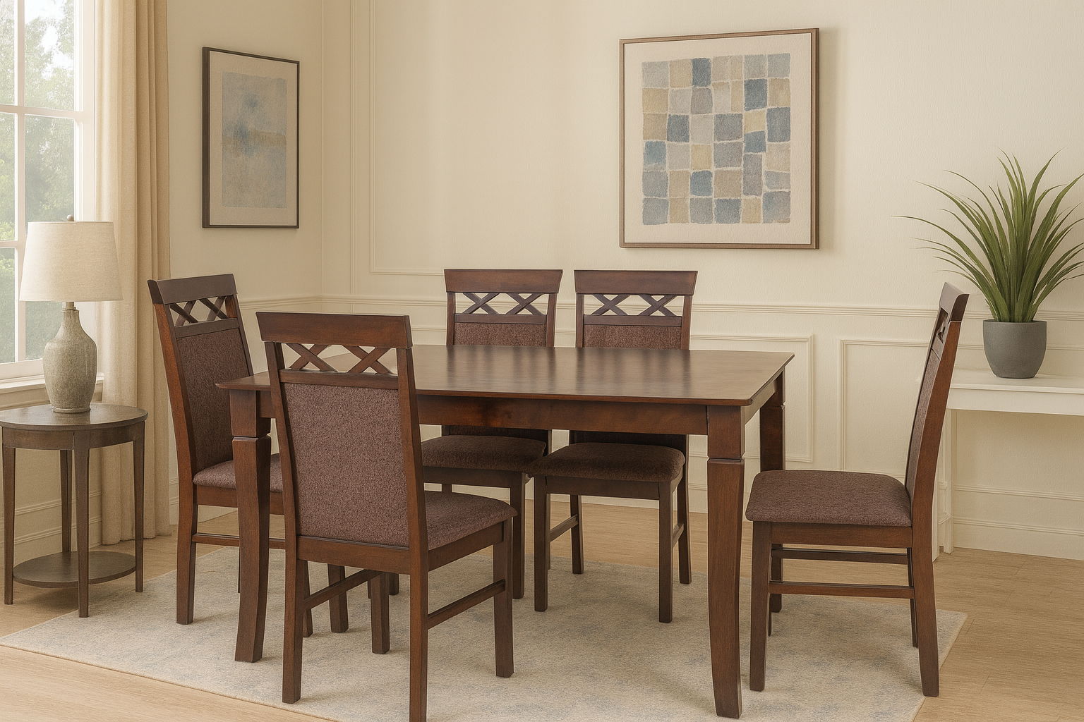 This Sachin Dining set in a 1+4 configuration offers an intimate and practical dining solution with one table and four matching chairs, perfect for small families or cozy dining spaces. The collection features thoughtful design elements that balance functionality with aesthetic appeal, making it suitable for both everyday meals and special occasions. Each chair is crafted for comfort during dining, while the appropriately sized table provides adequate surface area without overwhelming smaller dining rooms or kitchen areas. The coordinated design ensures visual harmony throughout the set, creating a cohesive and inviting dining environment that encourages family gatherings and conversation. This compact yet stylish Sachin dining ensemble is ideal for apartments, breakfast nooks, or any space where efficient use of area and elegant dining experiences are equally important.